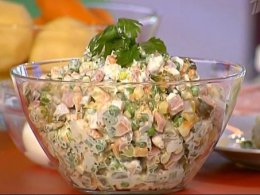 Японка Мікі - в захваті від салату. Дівчині сподобався і вигляд, і смак. А це вже дегустують "олів'є" американці. Вердикт Юджина - легкий і свіжий салат! Не такий вже й легкий - кажуть дієтологи. Але одна невеличка порція з долоню точно не зашкодить. Це дуже калорійна страва! У 100 грамах "олів'є" майже 200 калорій й 17 - жирів! Та салат можна полегшити.